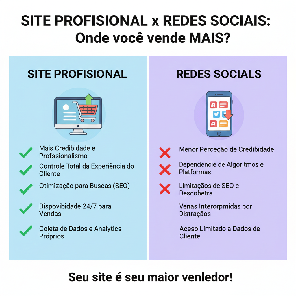Um site profissional aumenta a credibilidade da sua marca, funciona como seu canal oficial na internet e ajuda a atrair, informar e converter clientes 24 horas por dia. É a base da sua presença digital.